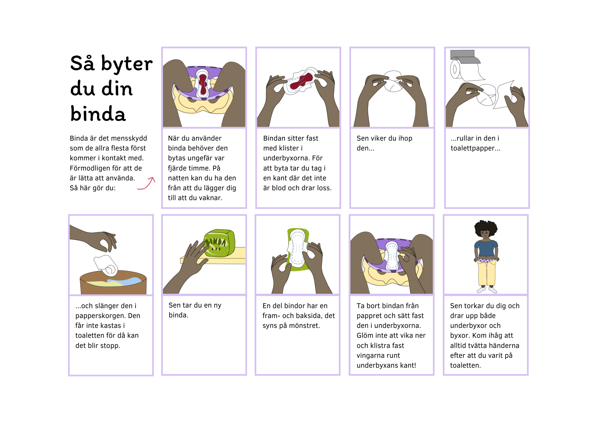Binda är ett skydd som fångar upp mensen utanför kroppen. Den sätts i underbyxan och absorberar blodet. Absorbera betyder ungefär att suga upp och många bindor suger upp så bra att de inte ens känns våta när de är fulla med mensblod.