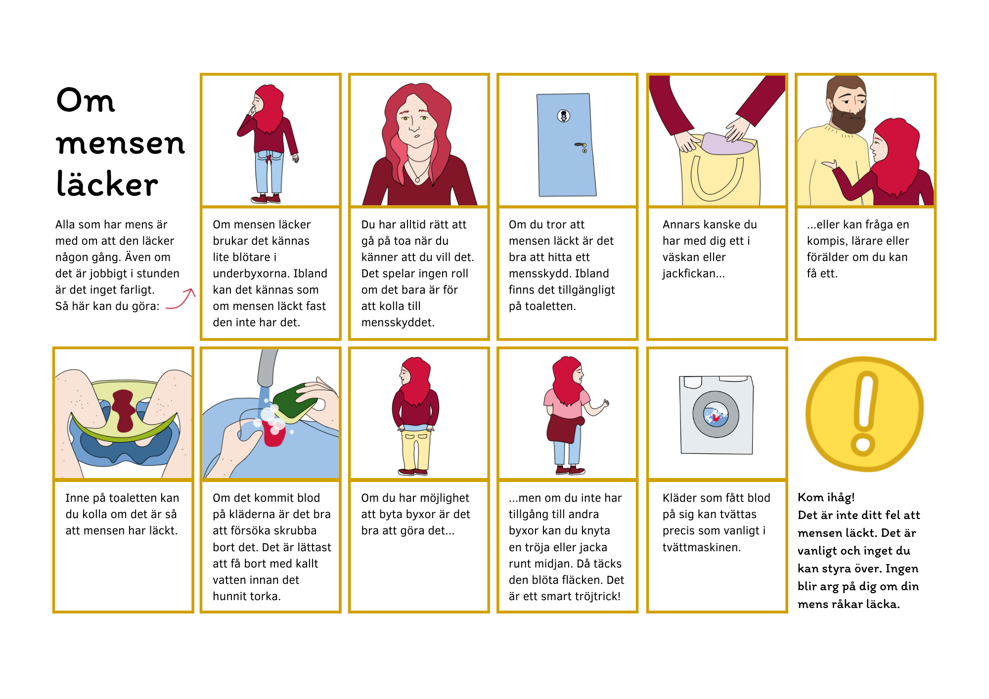 Om du märker att det har läckt mens på byxorna och du inte har möjlighet att byta byxor kan du sätta i ett nytt skydd och sen ta en tjocktröja eller jacka och hänga runt midjan ner över rumpan. Då syns inte fläcken och du behöver inte oroa dig.