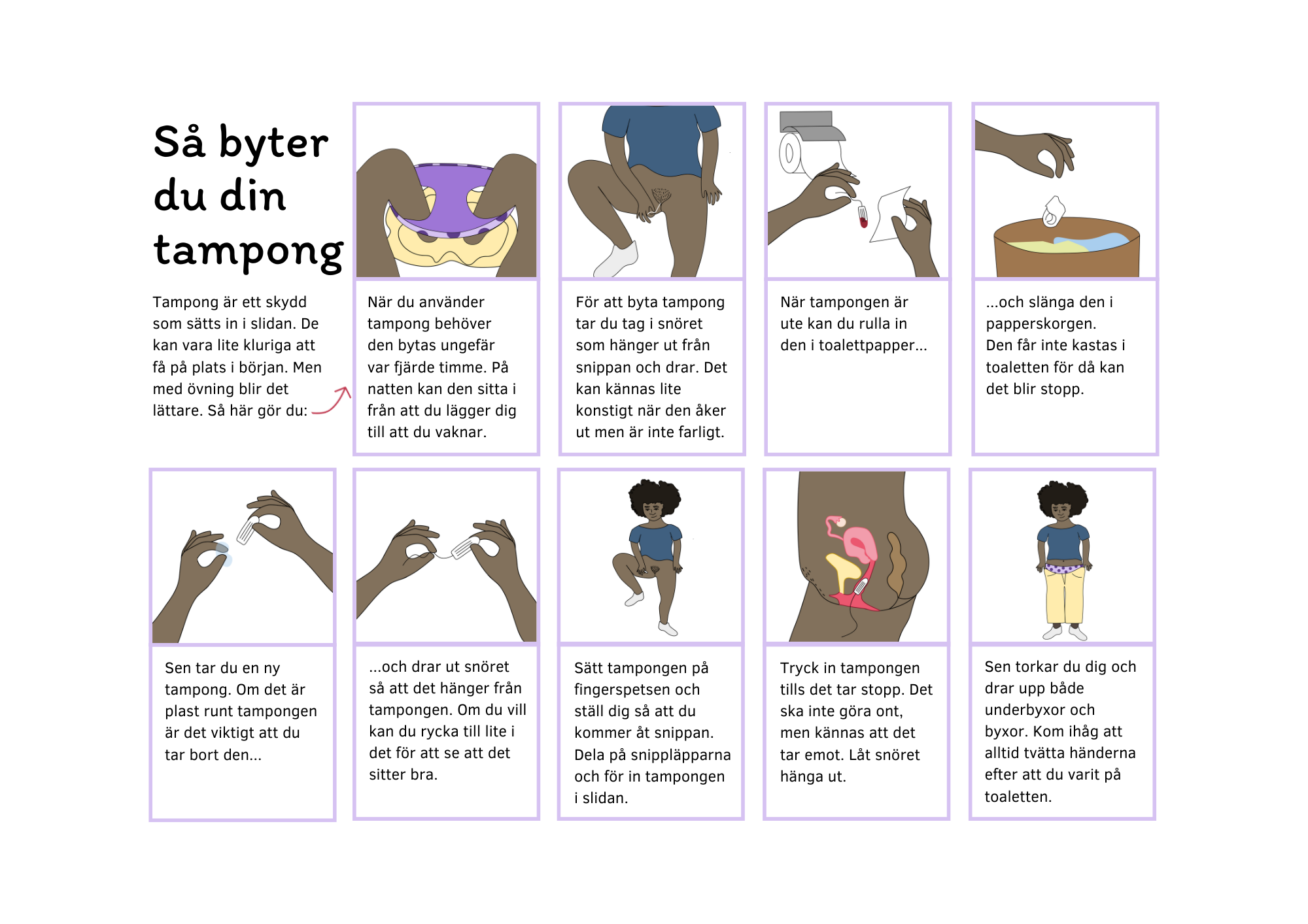 Tamponger ska bytas var 4-6 timme och får sitta inne som mest i 8 timmar. Det går fint att sova med tampong men då är det viktigt att sätta in den precis innan läggdags och ställa klockan så att man inte har den längre än 8 timmar.
